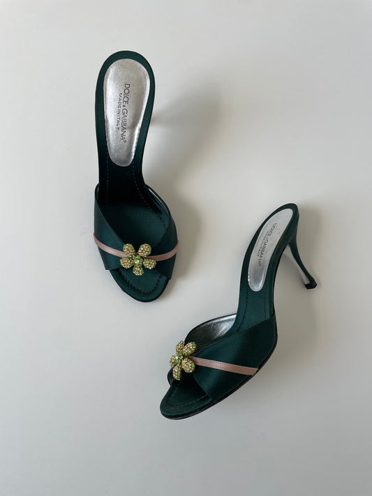 Dolce & Gabbana 2000s emerald satin rhinestone flower heels (EU 38,5 / US 8)