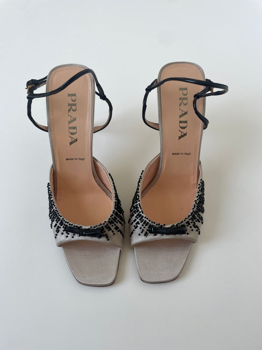 Prada 1990s cream white silk bow beaded heels UNWORN (EU 41 / US 10.5)