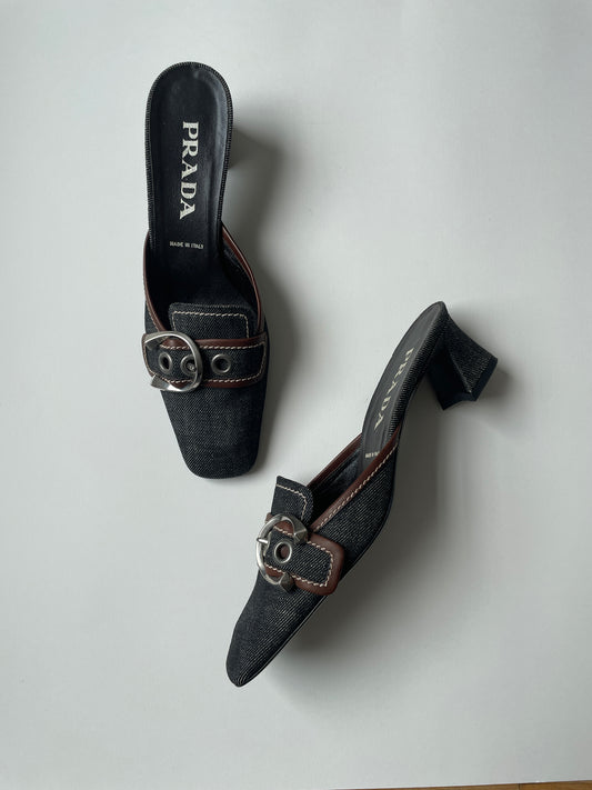 Prada 2000s denim buckle mules UNWORN (EU 39 / US 8.5)