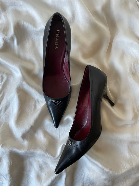 Prada S/S 2002 black leather silver buckle kitten heel mules (EU 40/ US 9.5)