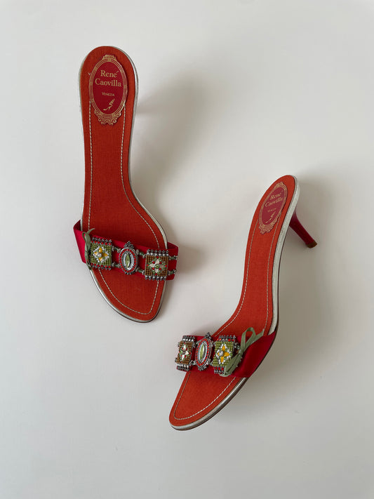 Rene Caovilla 2000s rare tangerine jewelry bow kitten heels UNWORN (EU 41 / US 10.5)