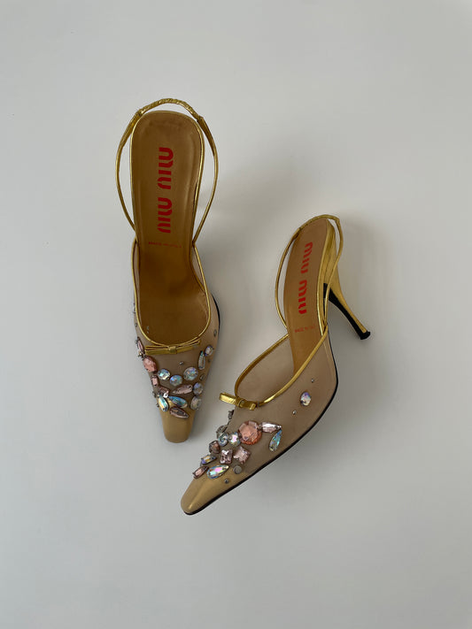 Miu Miu 1990s golden mesh rhinestone sling pumps (EU 39 / US 8.5)