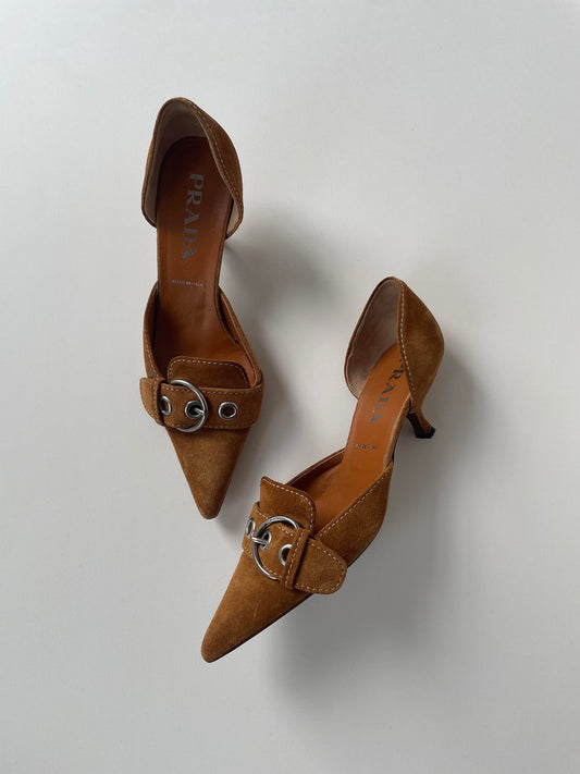 Prada tan suede leather silver buckle kitten heels SS 2002 (EU 37,5 / US 7)