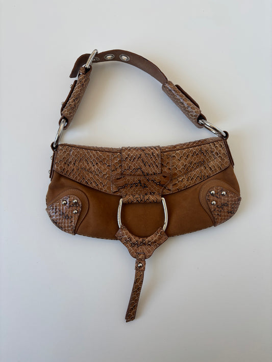 Dolce & Gabbana 2000s tan suede python D-Ring baguette bag