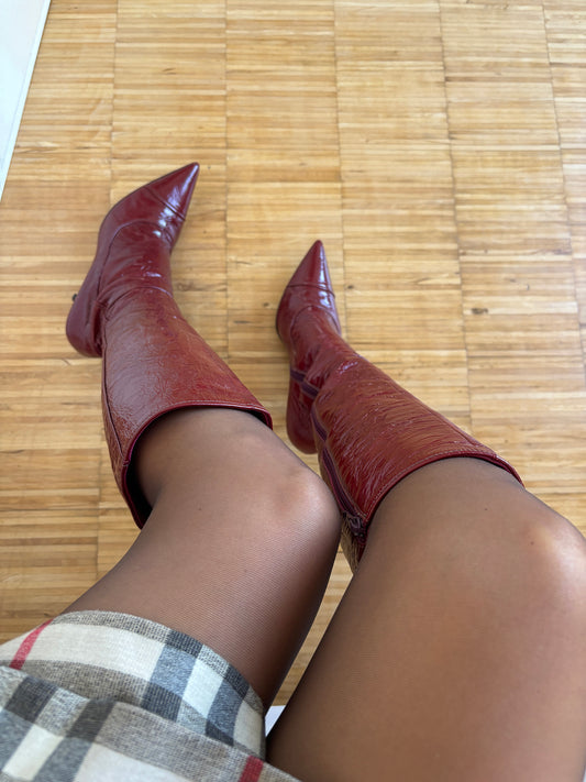 Miu Miu 1990s red crinkly patent leather kitten heel boots (EU 38.5 / US 8)