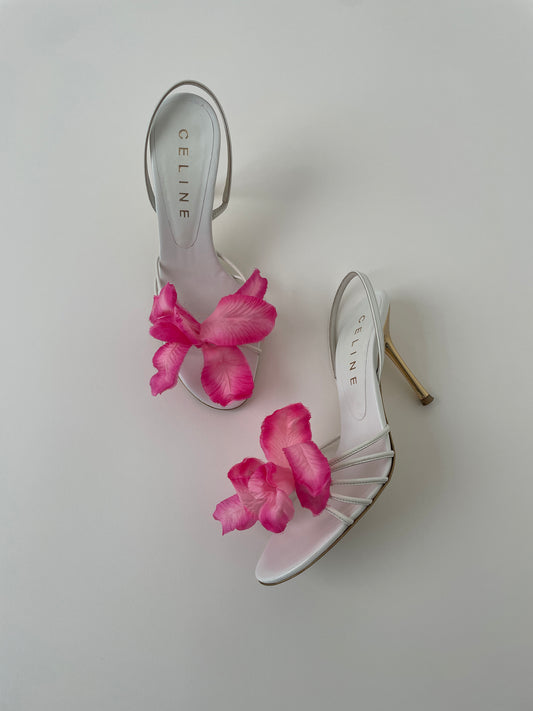Manolo Blahnik 2000s white silk pink beaded sling back heels (EU 39 / US 9)