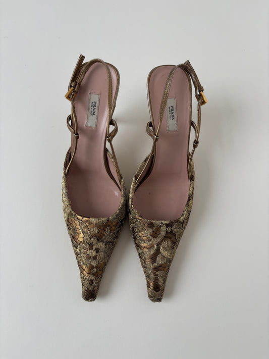 Prada 2000s golden lace kitten heel slingbacks (EU 36 / US 5.5)