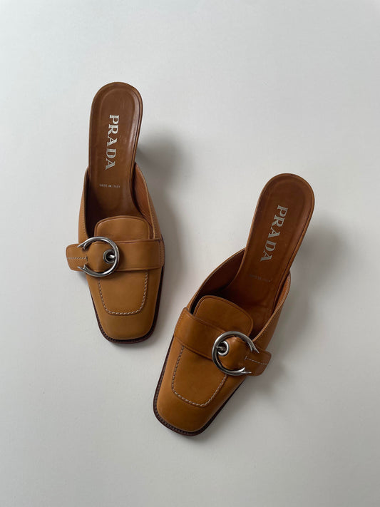 Prada 2000s tan leather buckle mules (EU 39 / US 8.5)