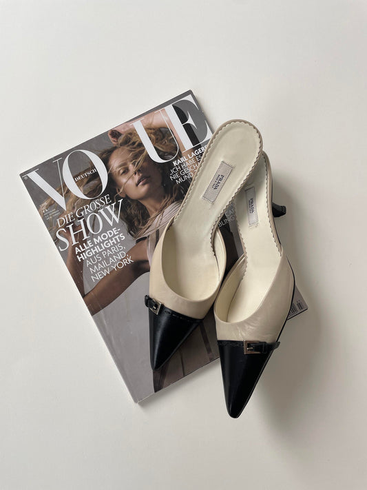 Prada 2000s ivory tiny buckle two tone kitten heel mules (EU 36,5 / US 6)