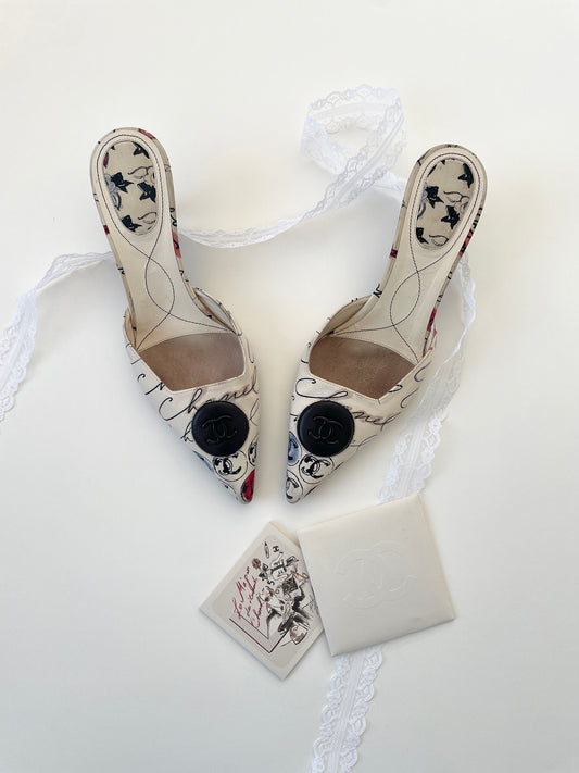 Chanel iconic 2000s by Karl lagerfeld edition CC cream white script illustration mules (EU 39 / US 8.5)