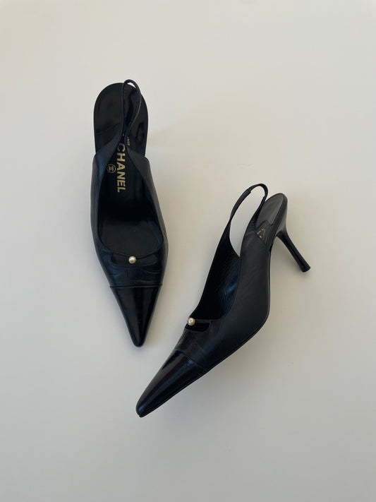 Chanel black CC by Karl Lagerfeld logo pearl sling backs (EU 40 / US 9.5)