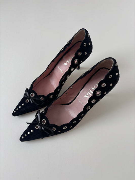 Prada 2000s iconic suede black eyelet bow heels (EU 37 / US 6.5)