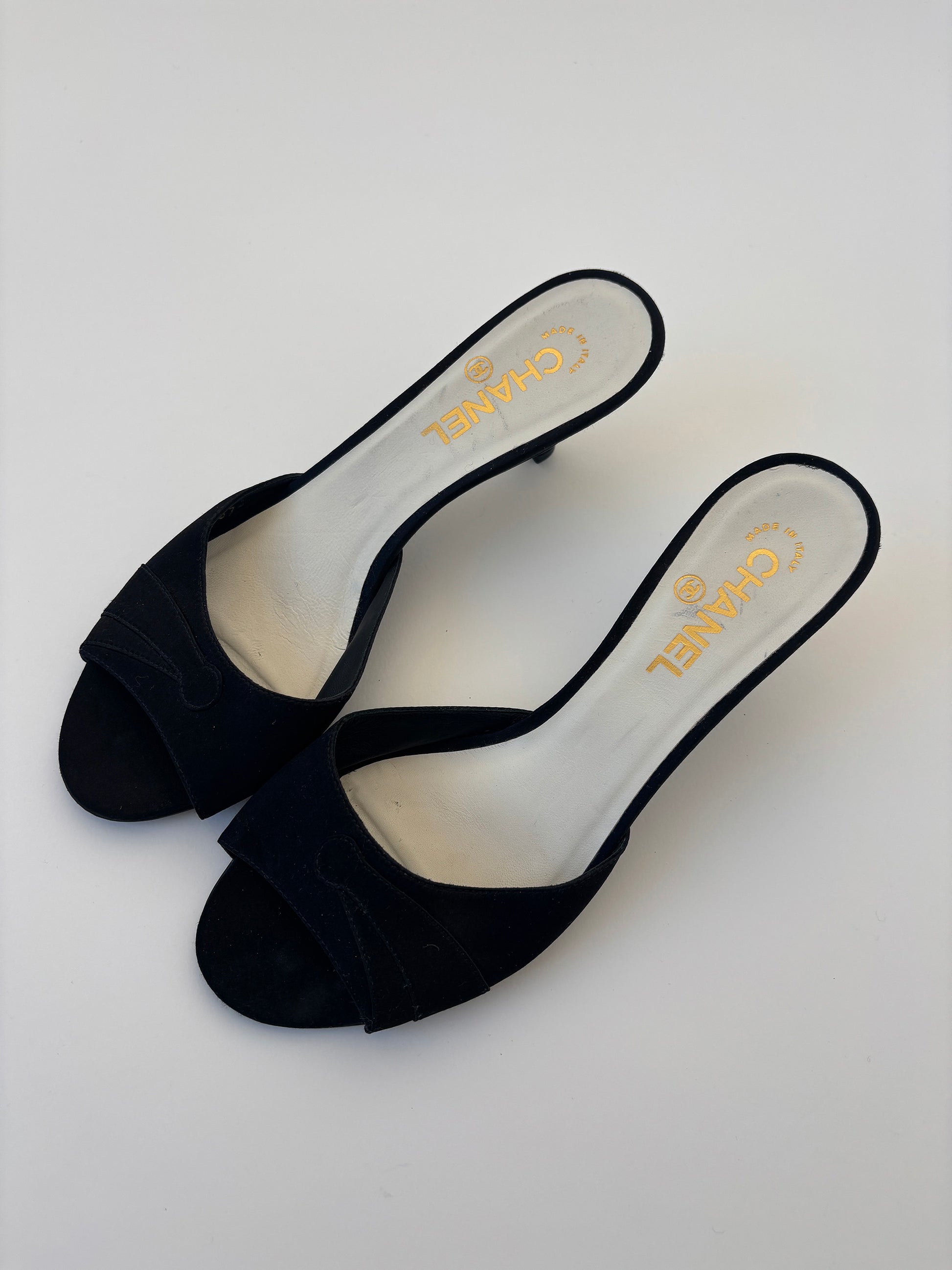 Vintage Chanel 1990s by Karl Lagerfeld black satin kitten heels.