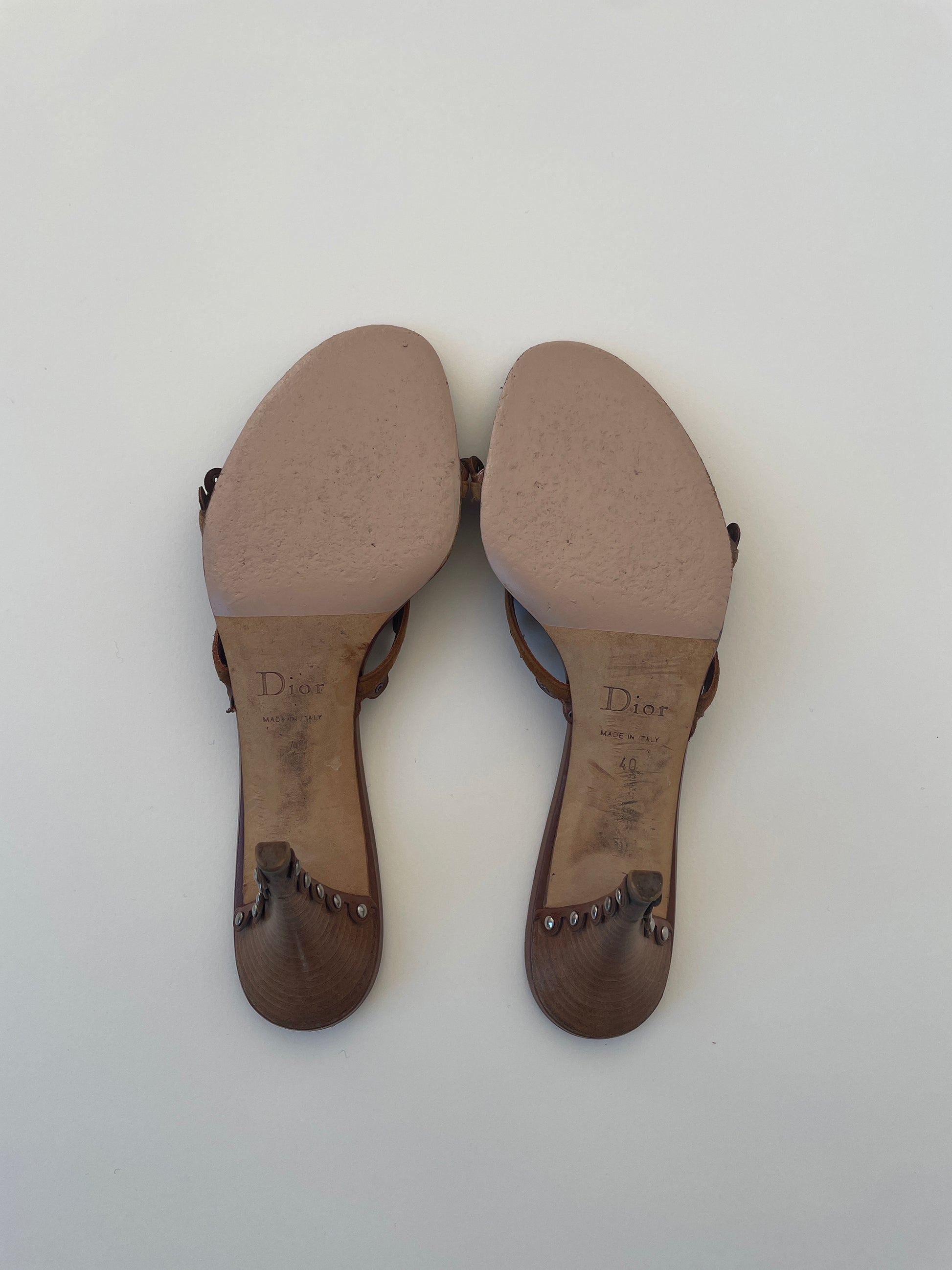 Vintage Christian Dior by John Galliano 2000s brown eyelet sandal heels with tiny metal logo detail.