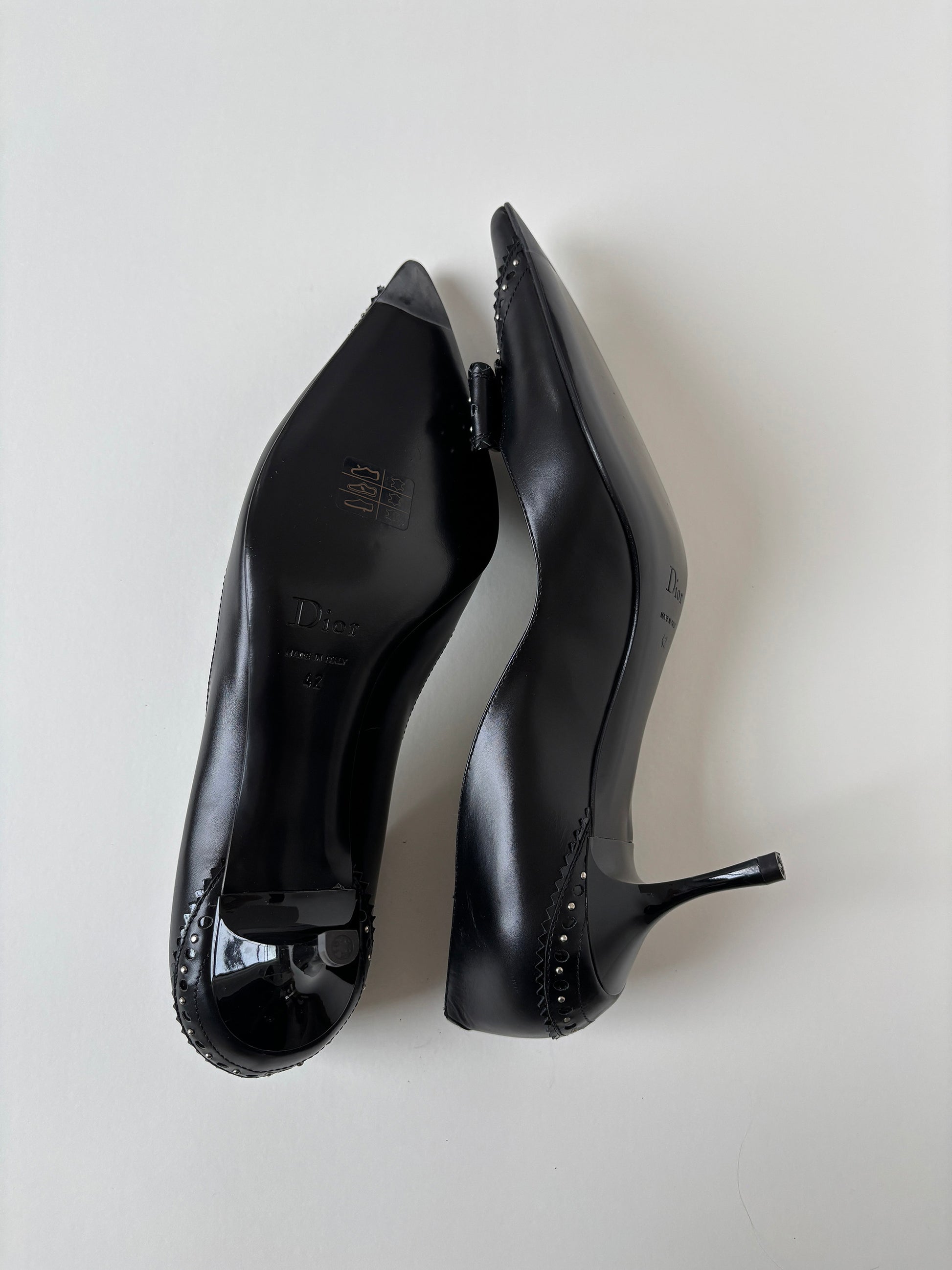 Vintage Christian Dior by John Galliano 2000s black D Trick bow kitten heels with cute mini logo and dainty eyelets.
