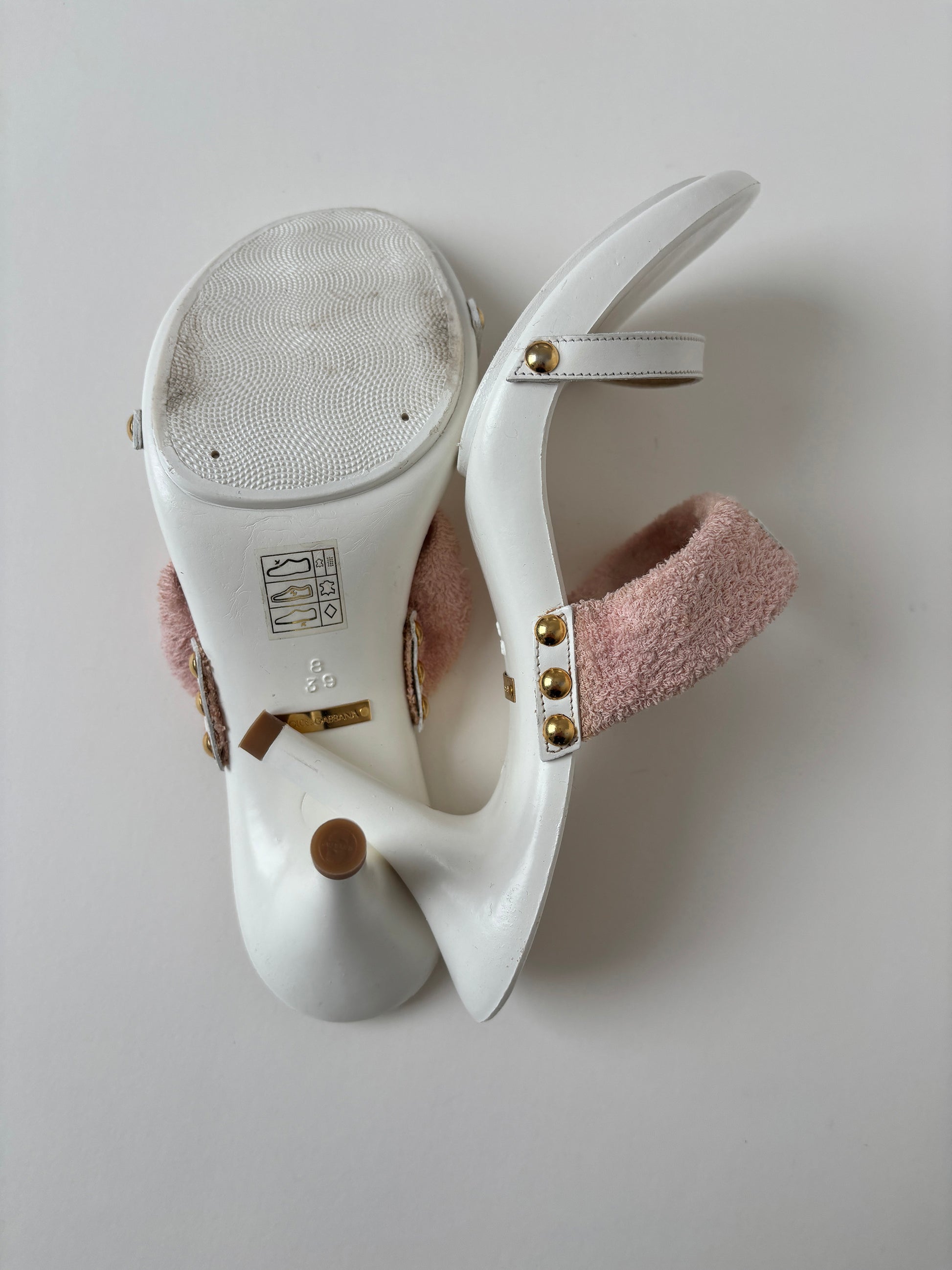 Vintage Dolce & Gabbana 2000s white platform mules with golden logo details and terry cloth.