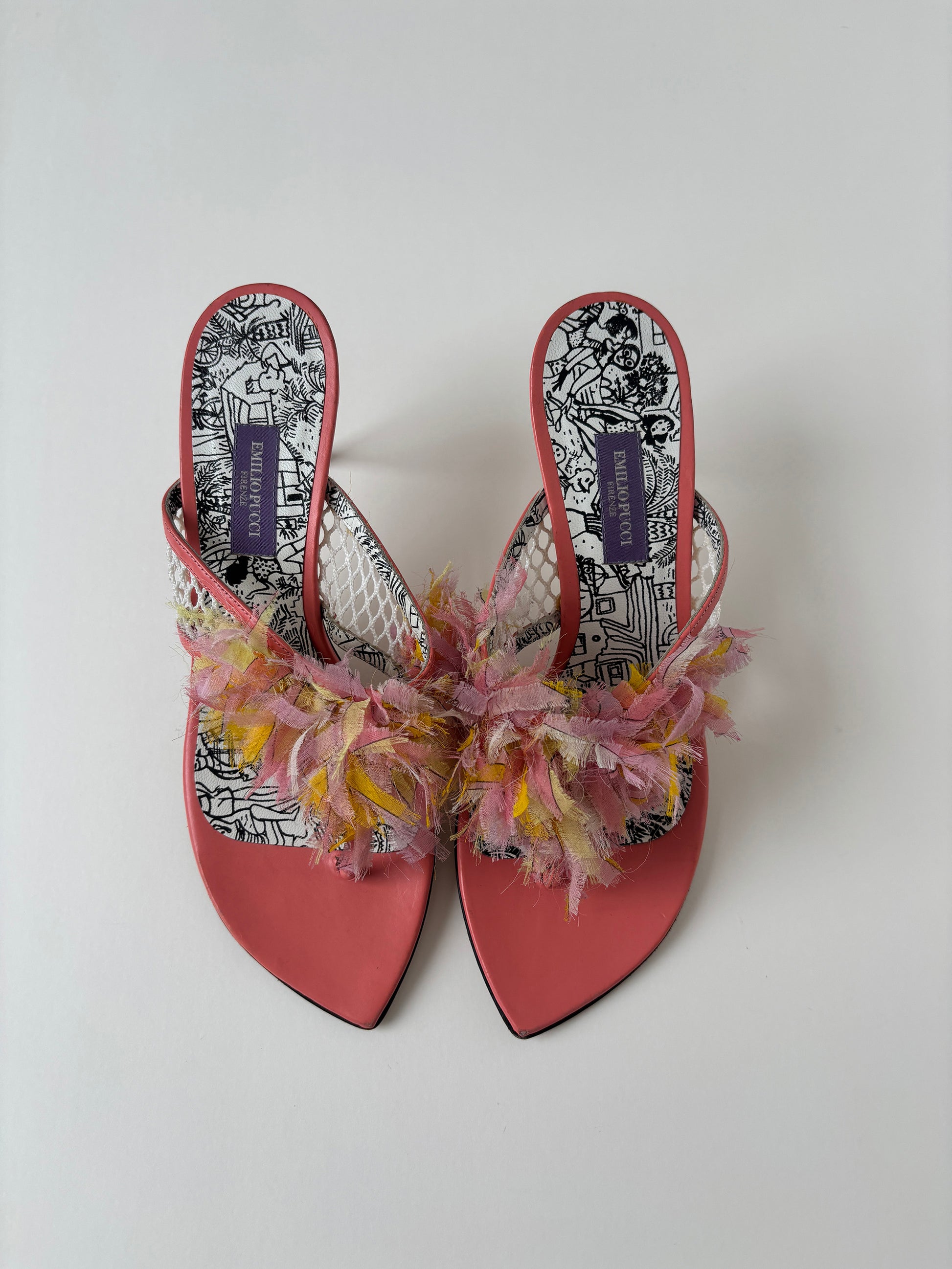 Vintage Emilio Pucci 2000s iconic peach pink ruffle thong kittenheels with cute details.