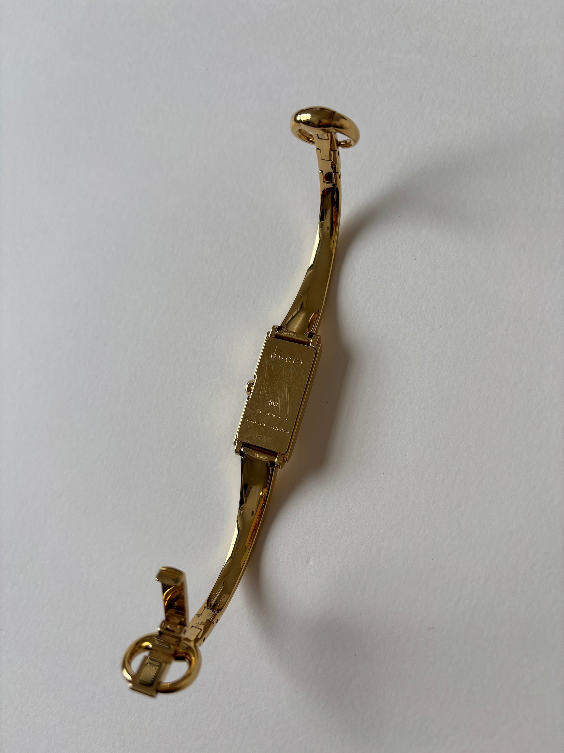 Vintage Gucci by Tom Ford 2000s 1500L 18K gold plated bangle watch with light golden dial with mini diamonds, a rider boots print and horsebit clasp