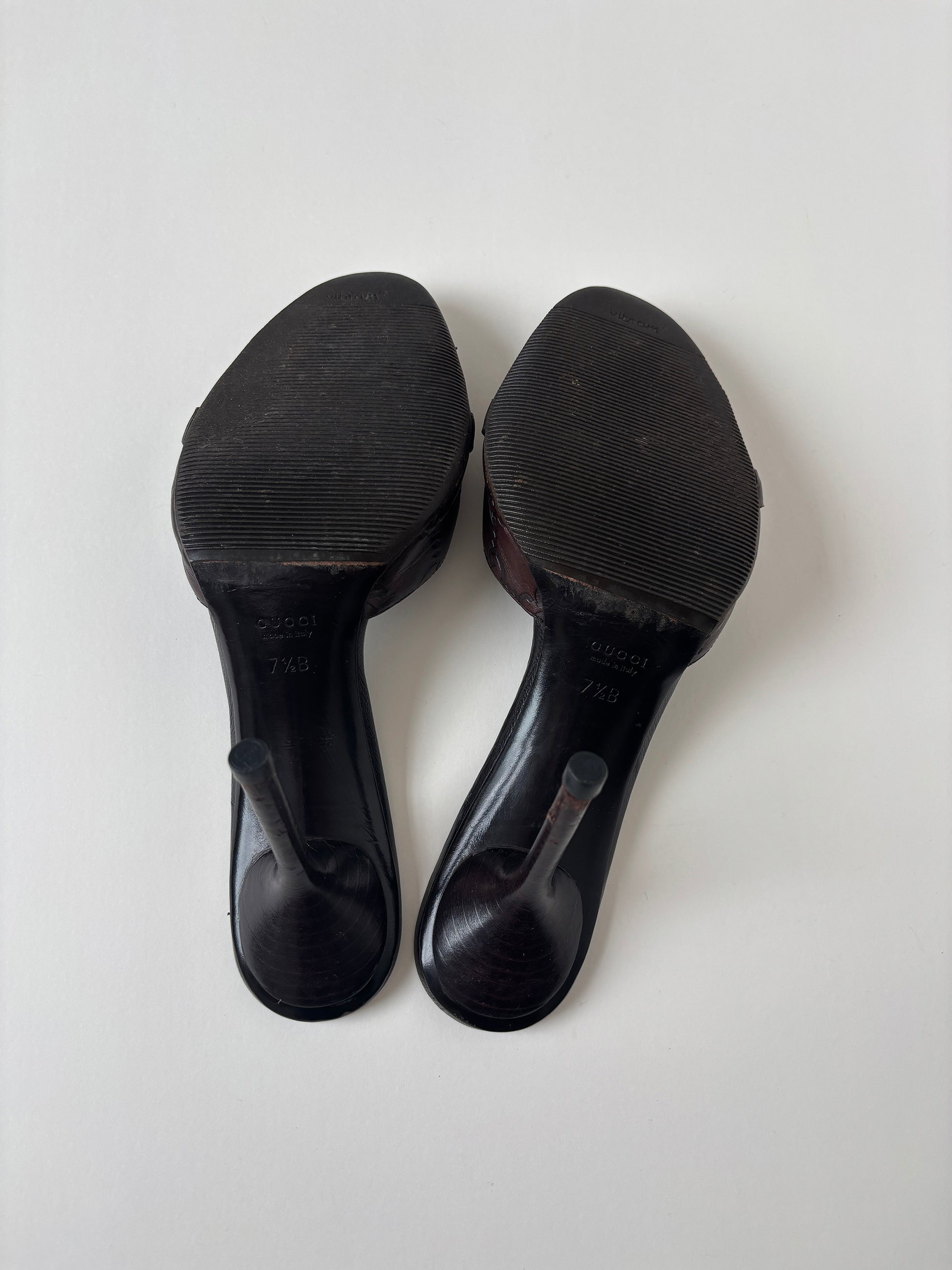 Vintage Gucci by Tom Ford 2000s dark brown embossed monogram leather sandals with silver horsebit details.