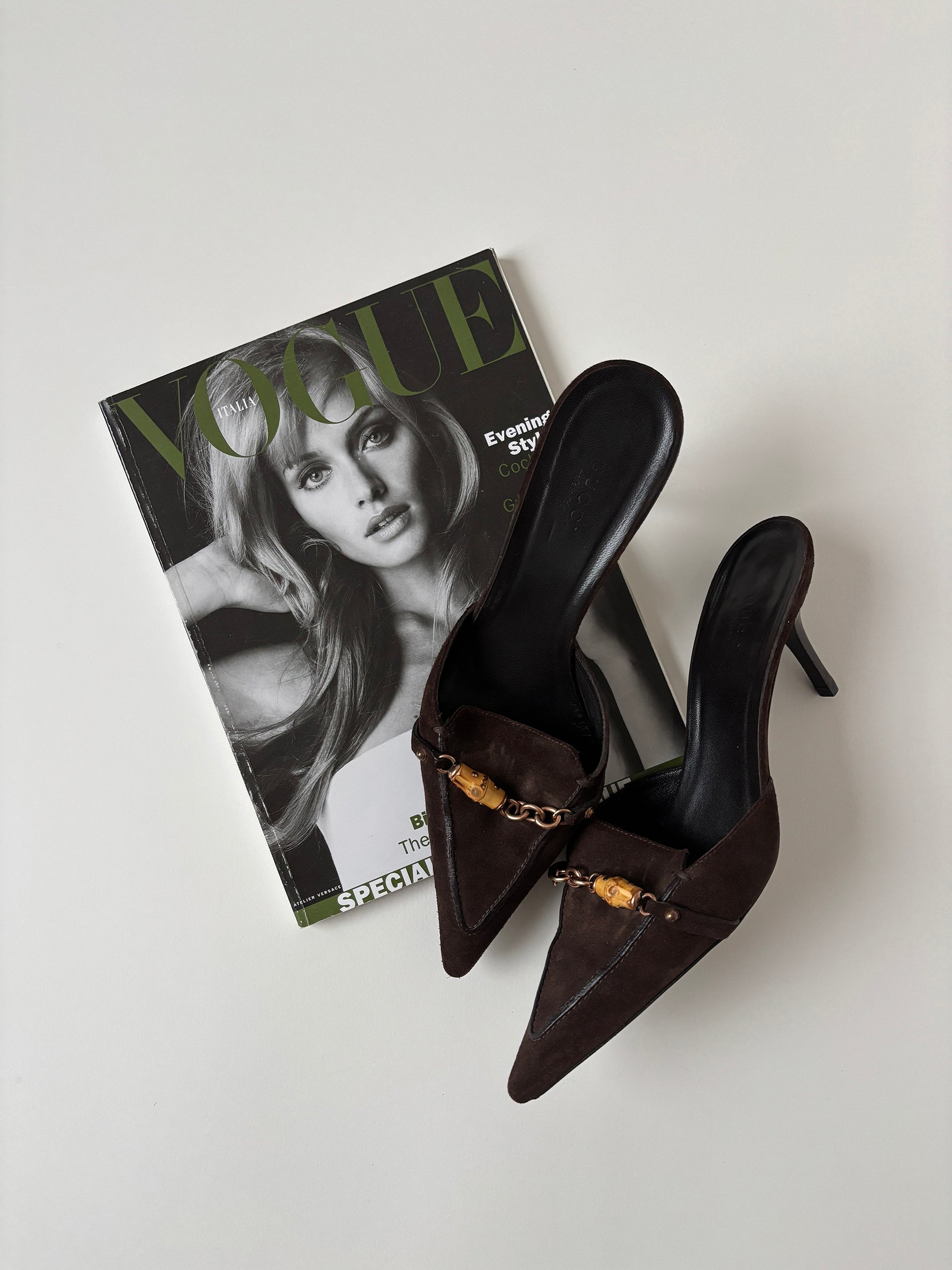 Vintage Gucci by Tom Ford 2000s dark brown suede bamboo mules.