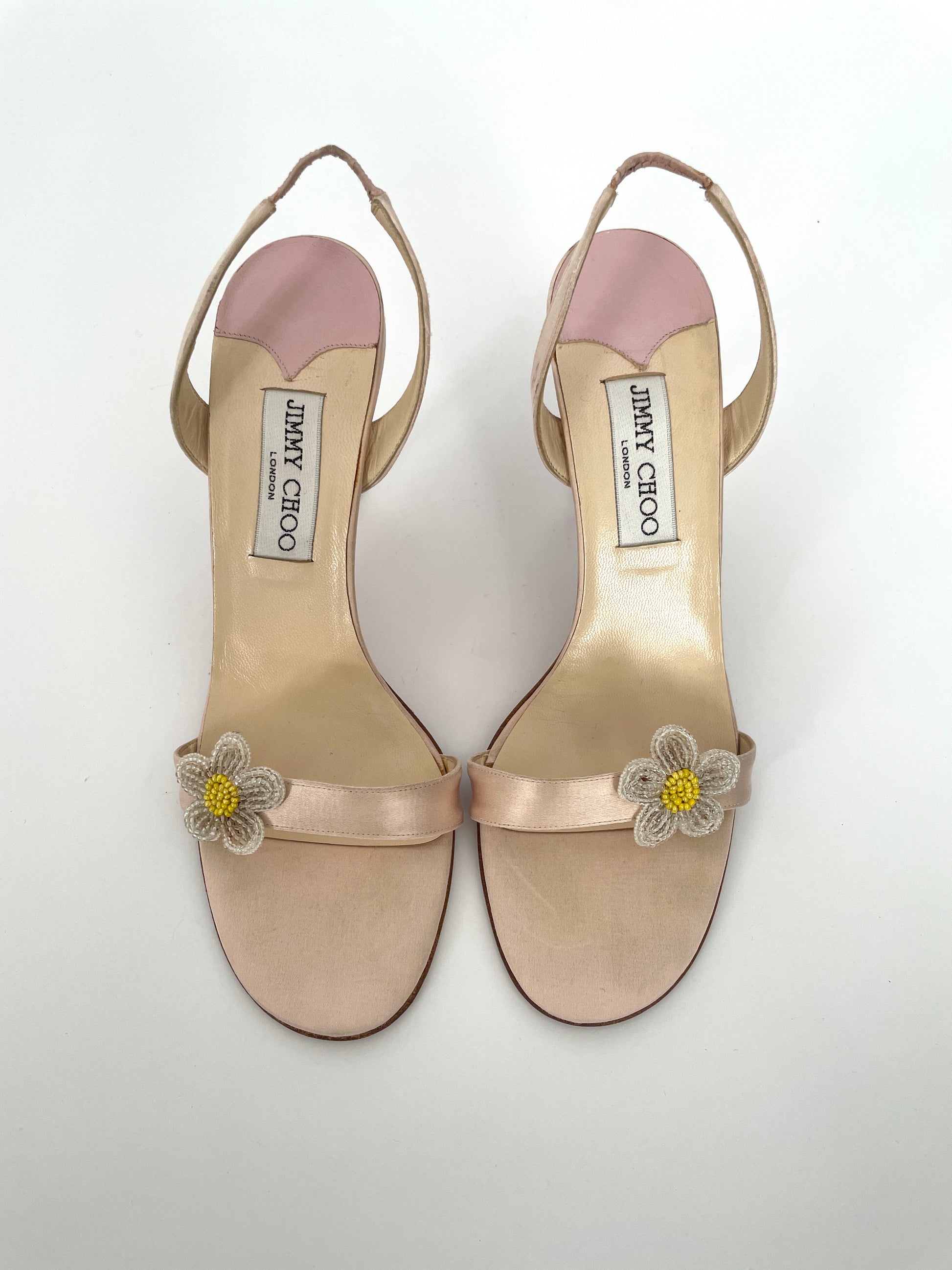 Vintage Jimmy Choo pink satin daisy heels with cute floral beaded application.