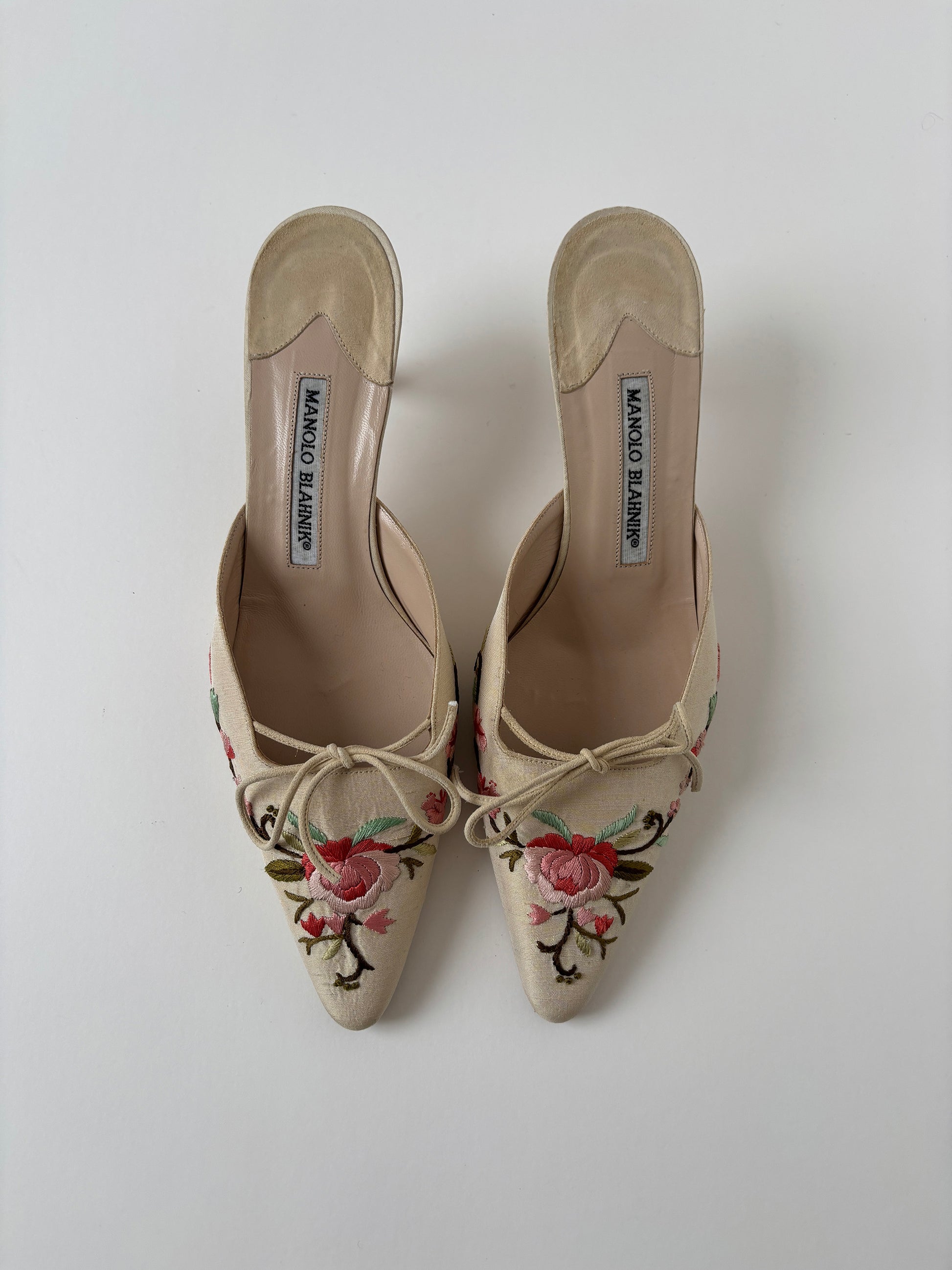 Manolo Blahnik 2000s ivory silk roses embroidery kitten heel mules (EU 39 / US 8.5)