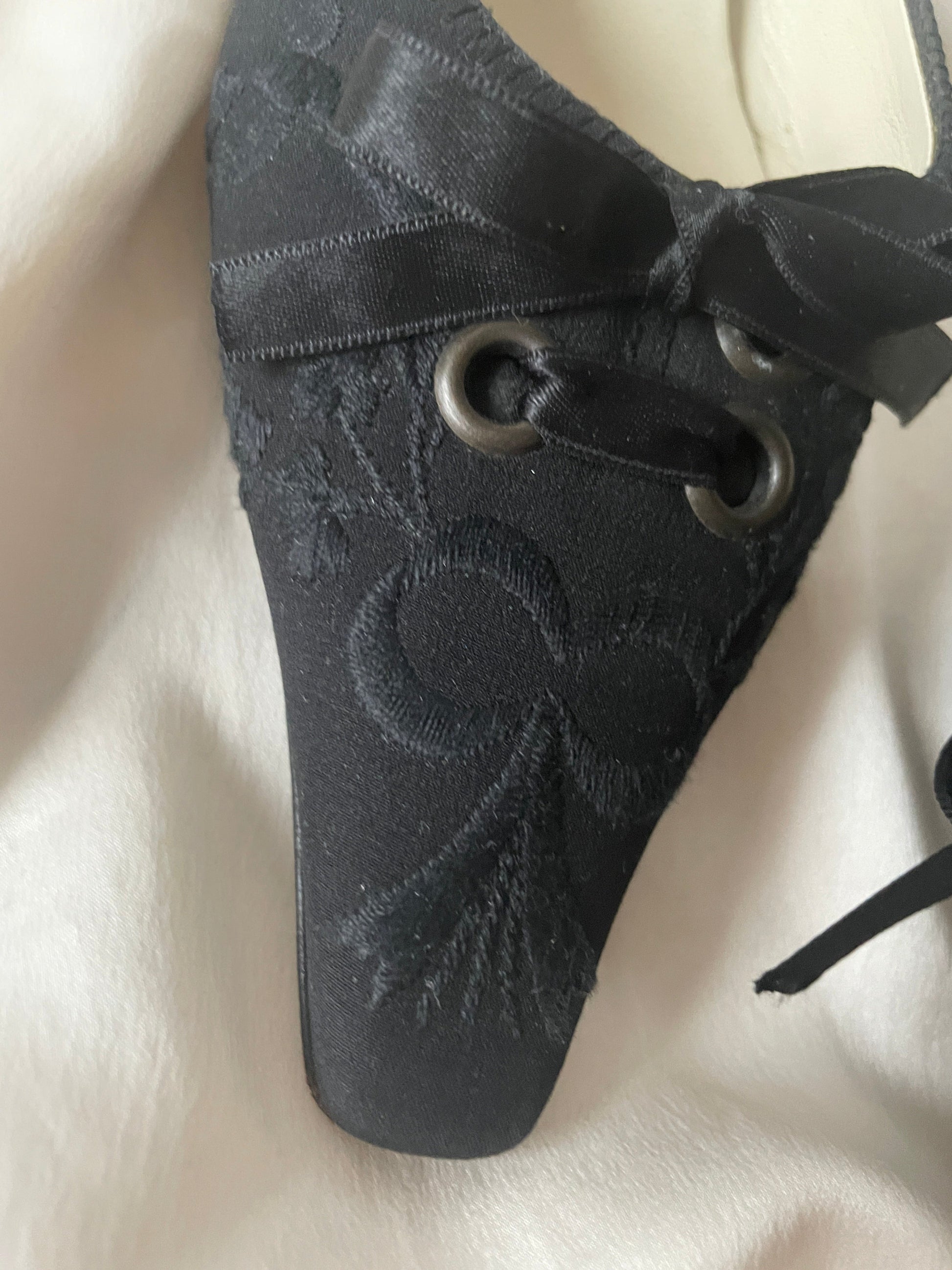 Vintage Miu Miu bow kitten heel mules with gorgeous embroidered details.