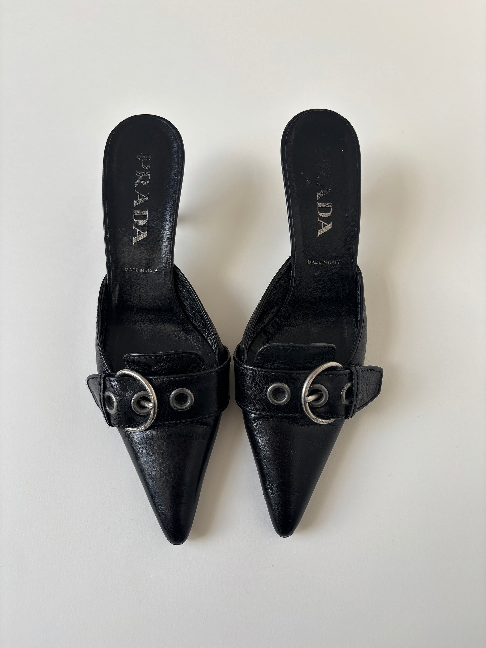 Prada S/S 2002 black leather silver buckle kitten heel mules (EU 38,5/ US 8)