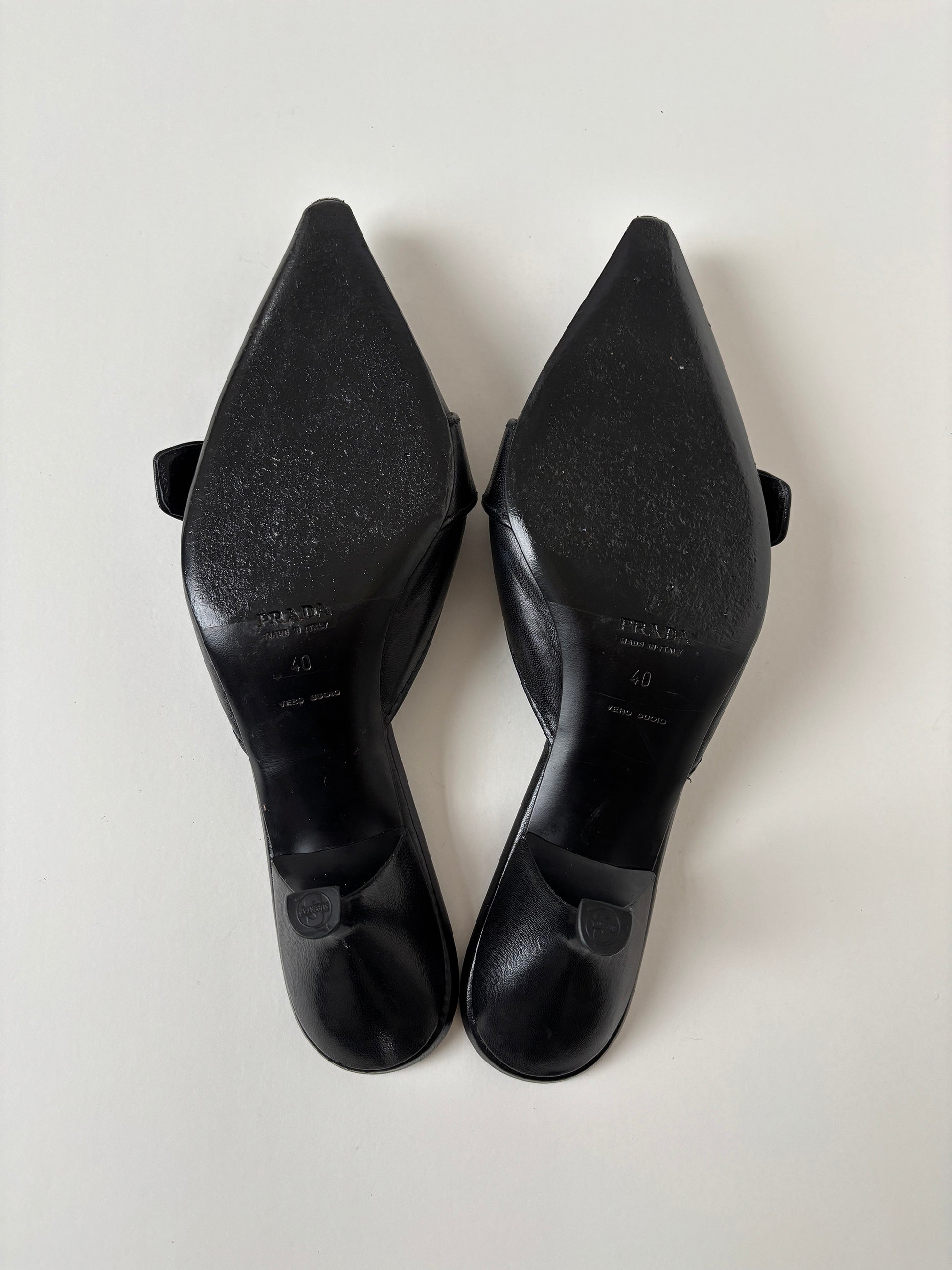 Prada S/S 2002 black leather silver buckle kitten heel mules (EU 40/ US 9.5)