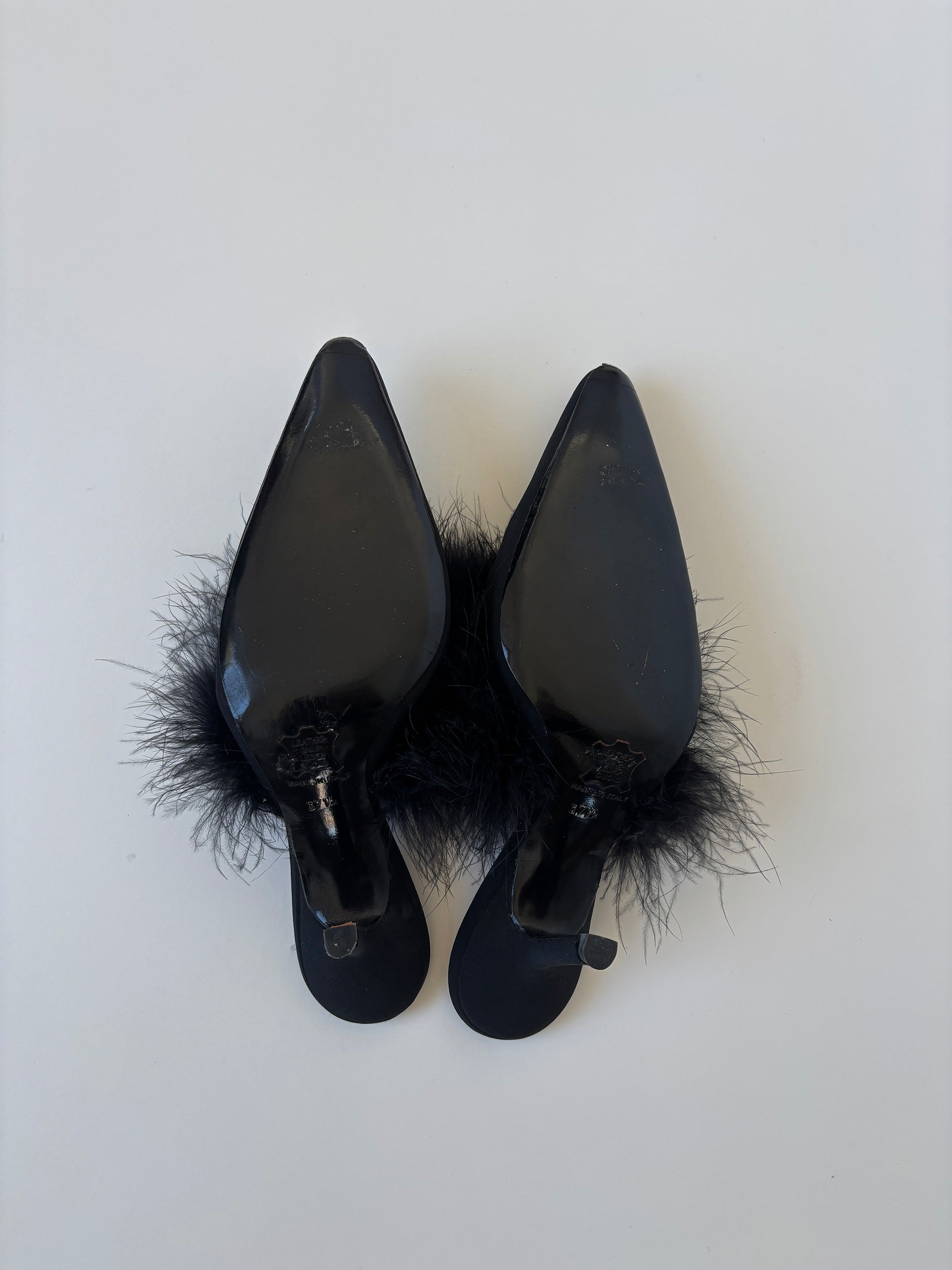 YSL 1990s black feather kitten heel mules UNWORN (EU 37,5 / US 7)